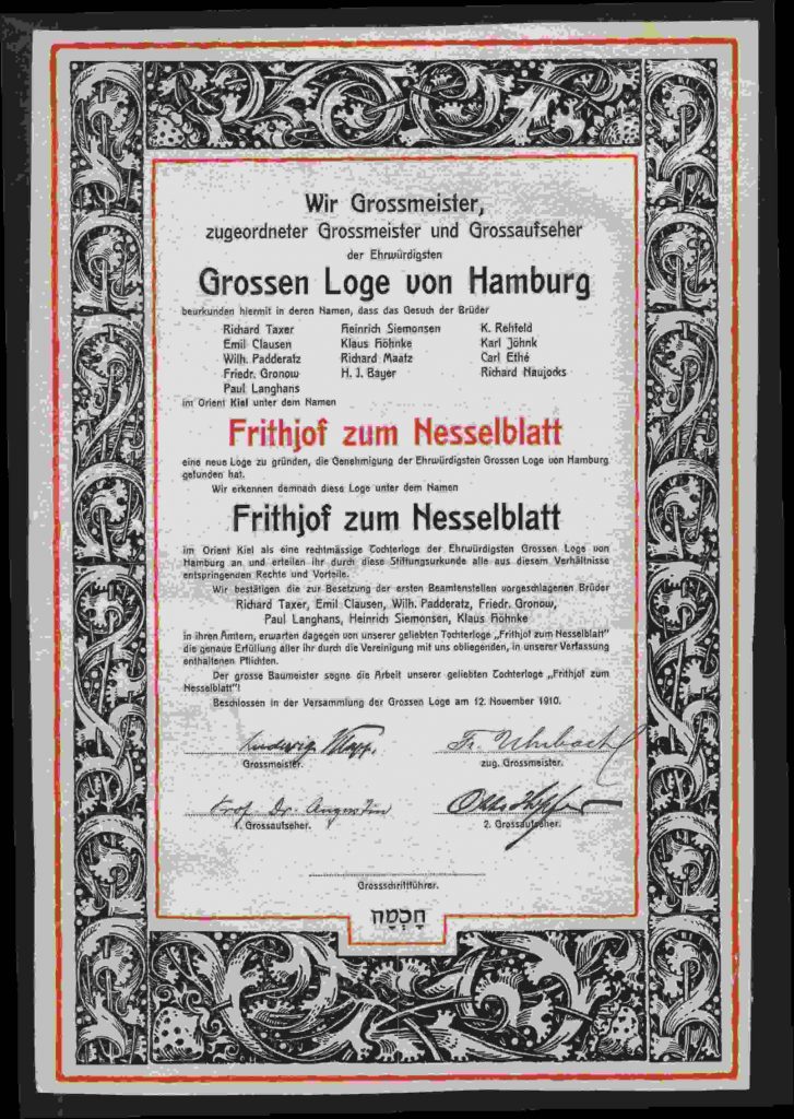 Am 12. November 1910 erlangte die Loge als Tochterloge der Großen Loge von Hamburg, einer Vorgängerin der heutigen Großloge der Alten Freien und Angenommenen Maurer von Deutschland, unter ihrem neuen Namen „Frithjof zum Nesselblatt“ schließlich die angestrebte Regularität.